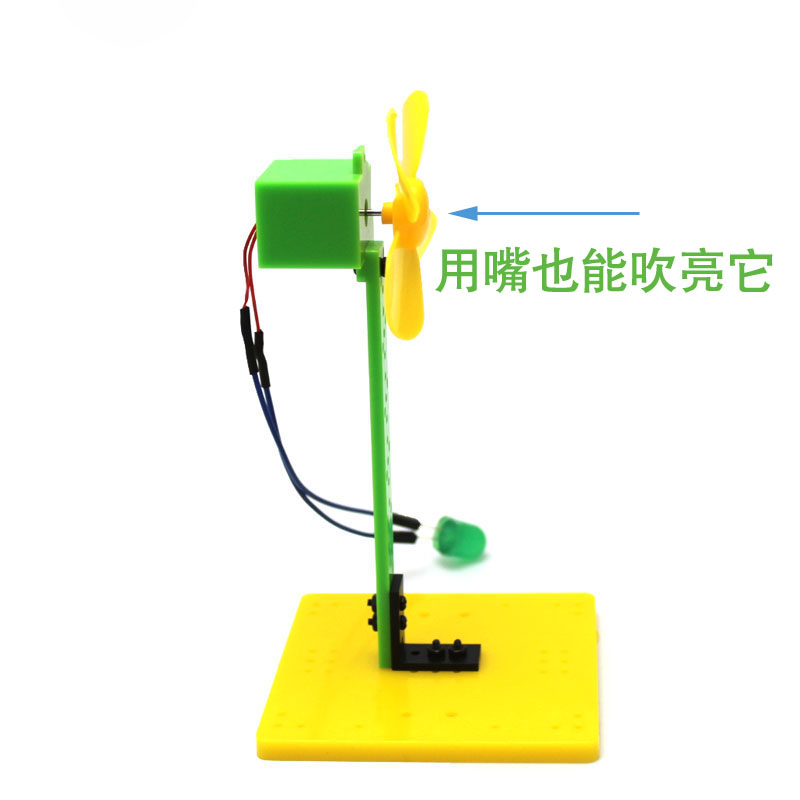 【实验方式】:此套件需要DIY制作,动手安装后,打开家用摇头扇,手持风叶靠近摇头扇,适当移动寻找风力稳定的区域与距离,当小风叶高速转动之后,就会点亮LED灯珠。不用风扇用嘴吹风叶,也可以点亮小灯泡。