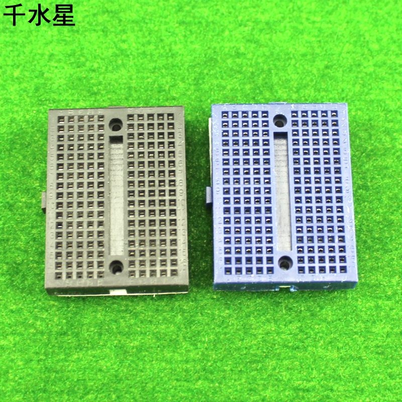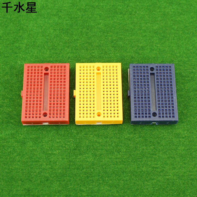 彩色迷你面包板,尺寸小,适合小型电子制作。侧面有拼接槽,可以多块拼接;底面有双面胶片,