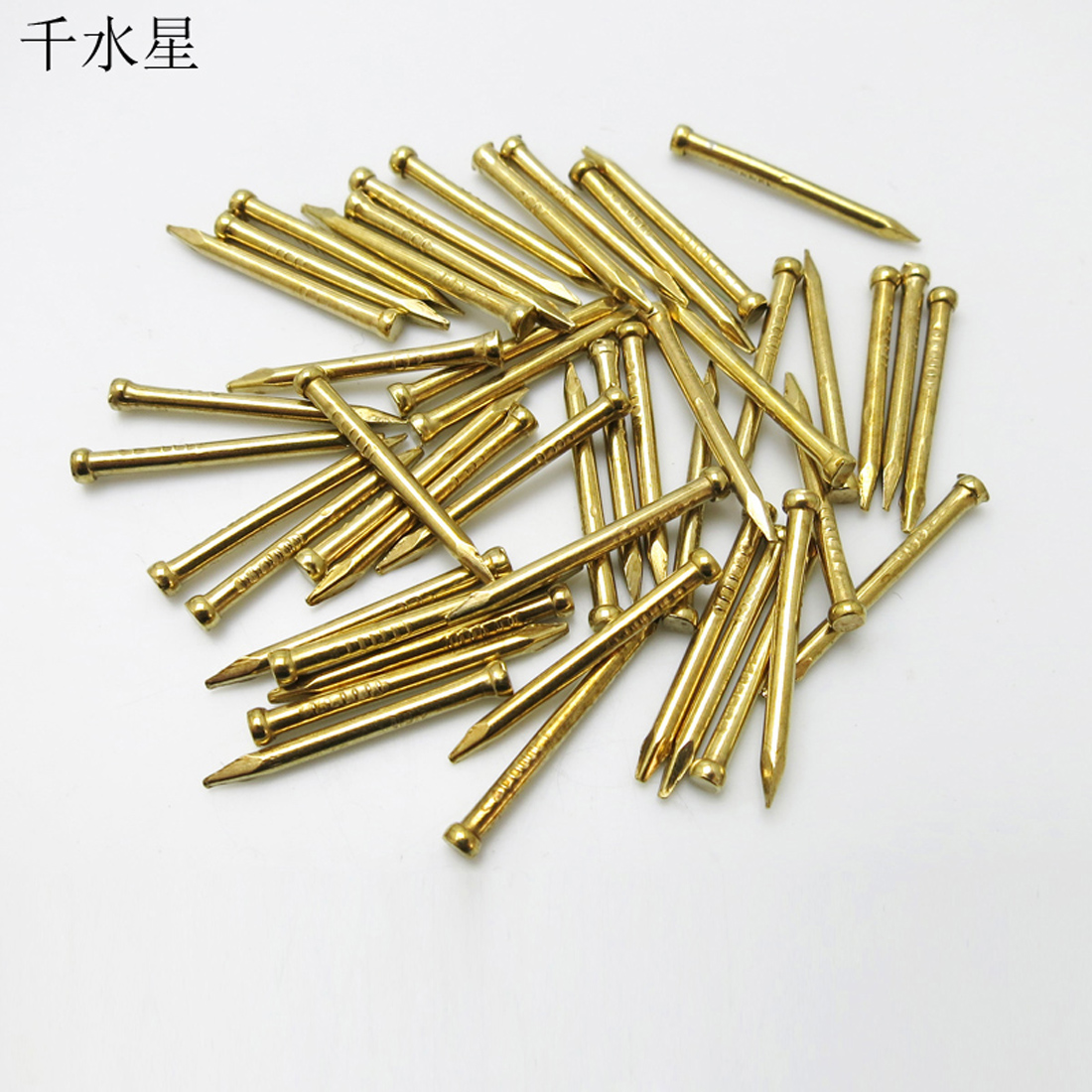 金黄色的迷你小钉,表面为镀铜处理的铁钉,非常小,模型专用,有2种长度,按包销售,详情如下: