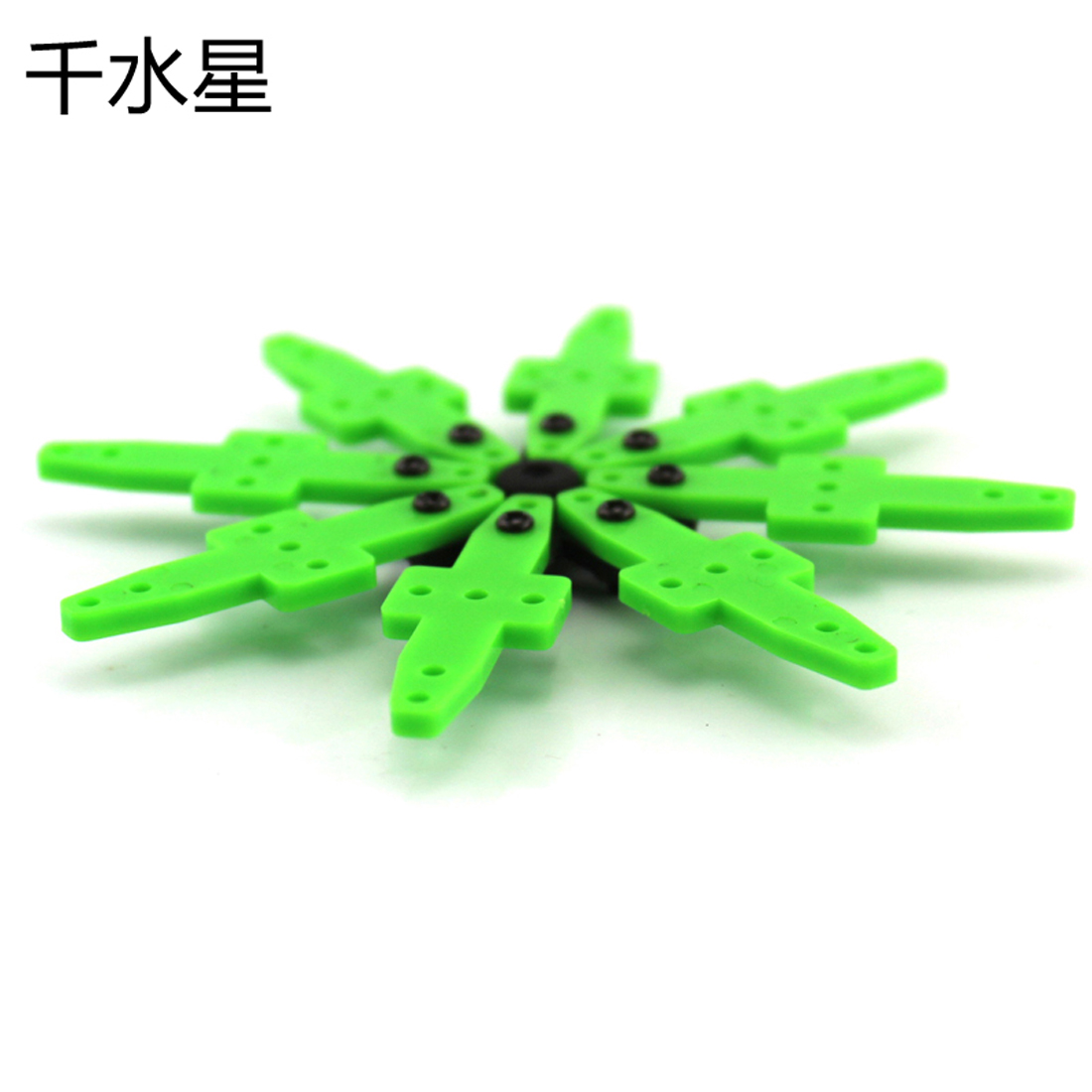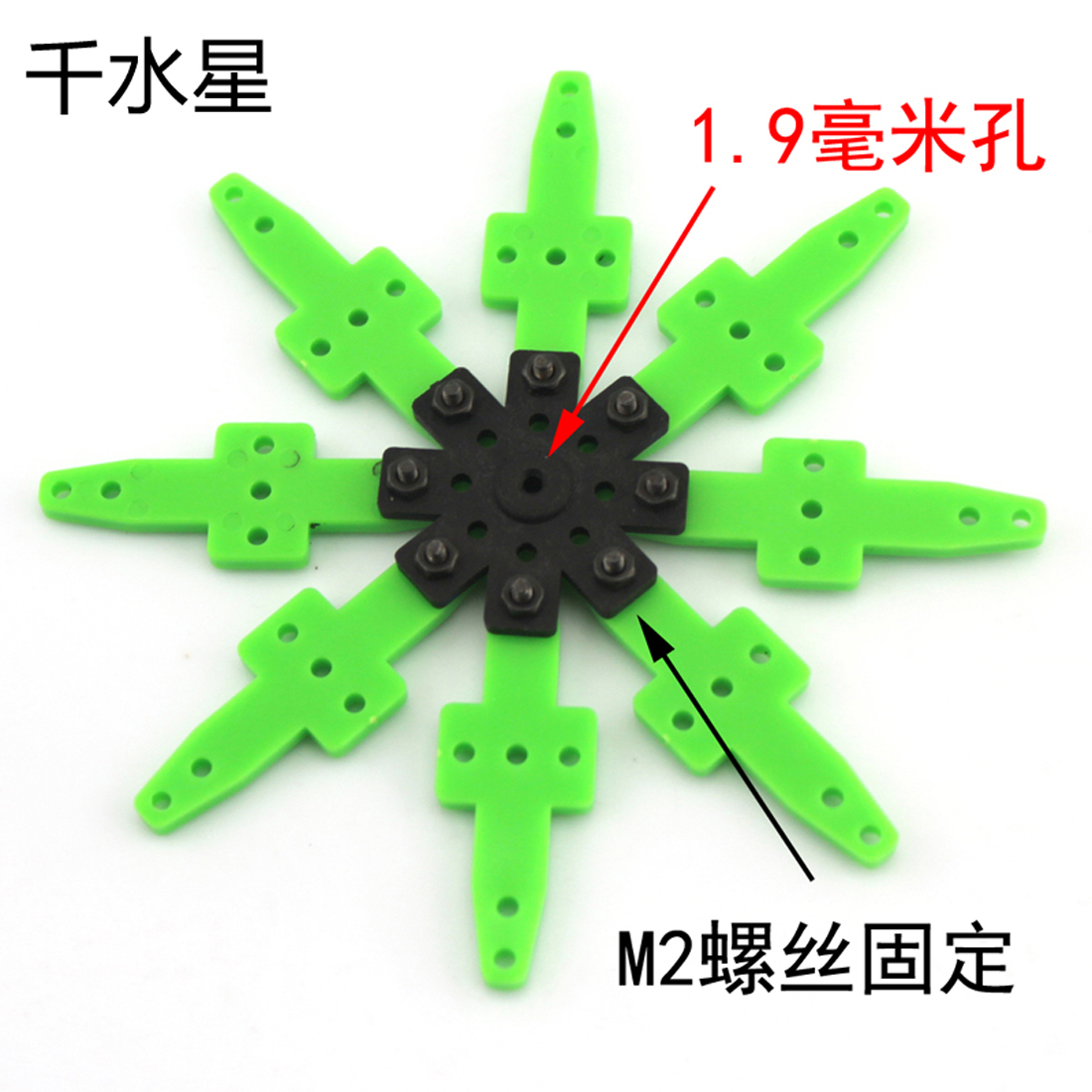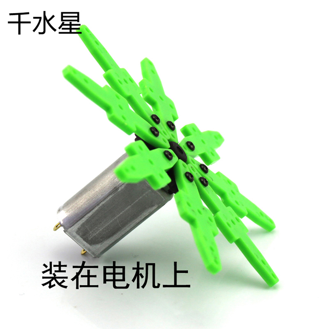 将雪花旋转盘安装到2mm轴电机上,制作创意DIY作品。例如安装到300太阳能电机上,搭配太阳能电池板,制作太阳能旋转花;安装到130电机上,观察单片机控制电机的转动效果…… 【外形尺寸】:10*10厘米 【中心孔径】:1.9mm(紧配2mm电机轴) 【产品材质】:绿色ABS+黑色尼龙 【发货提示】:产品是散件,收货后简单组装即可,配带小螺丝刀
