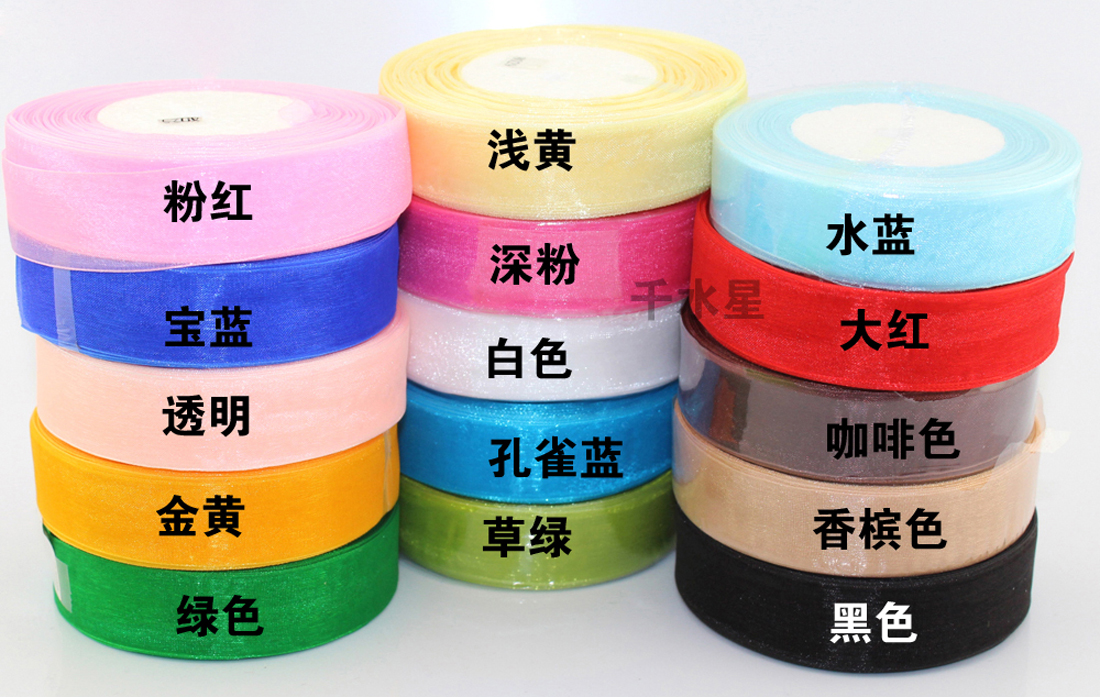 手工制作用的彩色纱带,色彩鲜艳。 宽度:2.5厘米 长度:45米 颜色:多种 包装:每卷厚度28毫米,直径100毫米 清单:1卷(45米)