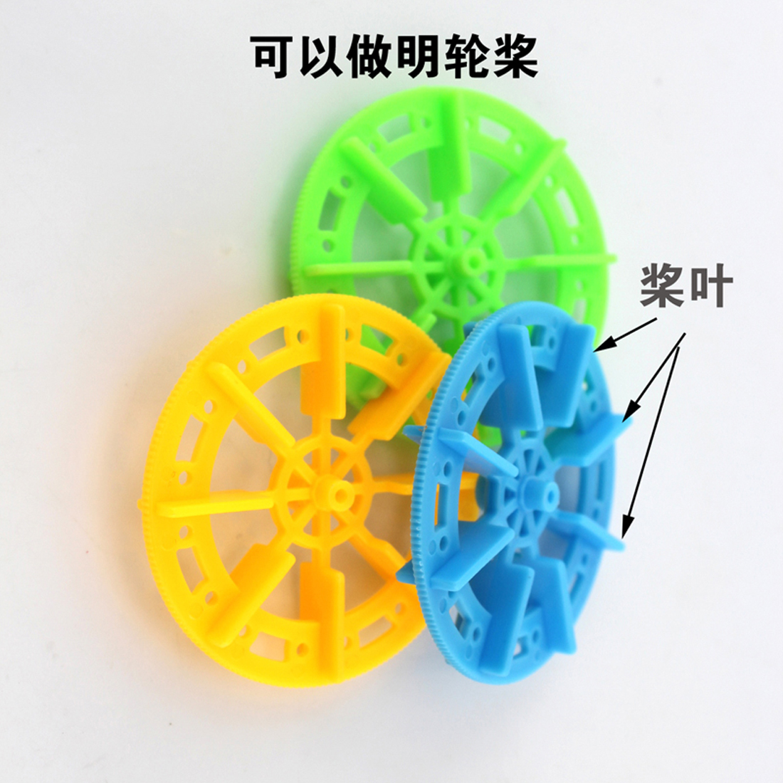 本车轮除了可以当轮子自制四驱车使用,还可以当做明轮船桨制作小船。3411花样车轮有正面和反面2个孔径,正面使用2mm车轴或电机轴,反面使用TT减速电机。