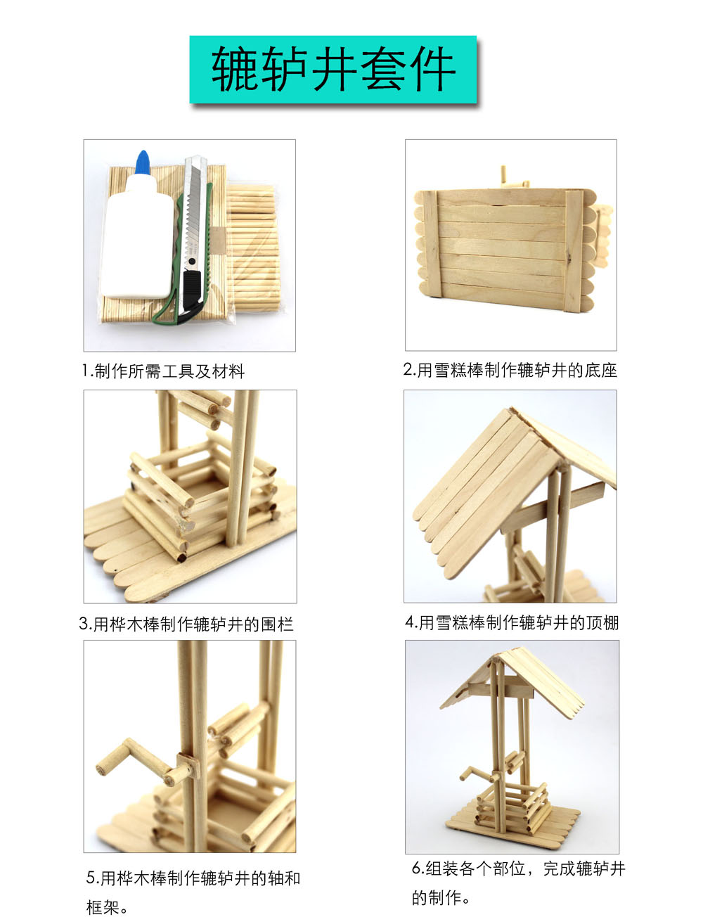 本产品是辘轳井套件材料包,内含精美说明书,只需按照说明书步骤即可完成如图所示的成品。这是非常趣味的diy手工作品哦