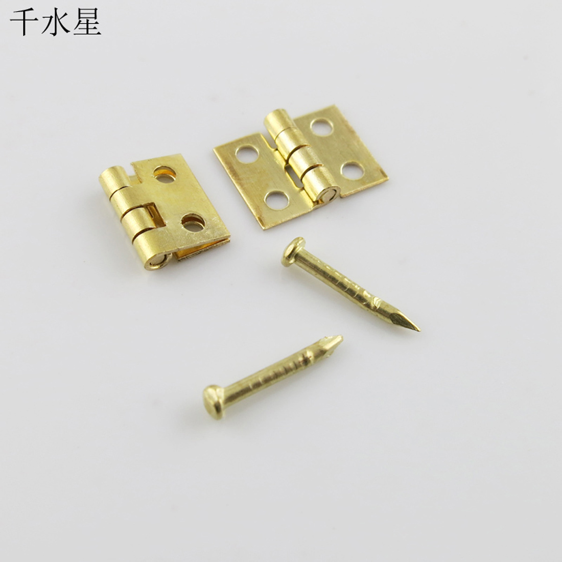 铜质金属小折页非常袖珍,DIY模型拼装折页。 【产品重量】:约14.6克 【展开后的尺寸】:宽度8mm,长度10mm,厚度0.5mm每包20只折页, 带80根配套的小钉子(钉子直径1.15mm, 长度8mm)。