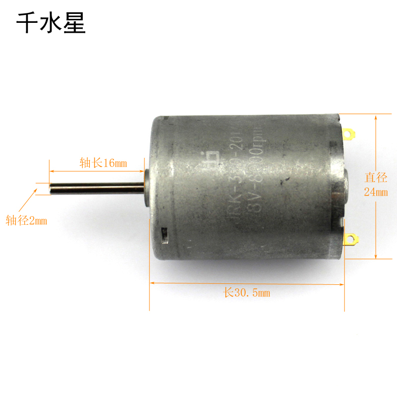 长轴370电机,一款适用于电动车模型与科技发明创作的模型电机,本电机做工好,性能稳定, 可以长时间运转。 【额定电压】:8V,转速8000rpm 【转速范围】:6V到8V时候,空转转速从2400-8000rpm。 【空载电流】:6V时,0.08A 【堵转电流】:6V时,0.45A 【电机出轴】:轴径2mm,长度16mm 【电机尺寸】:直径24mm,长度30.5mm 【安装孔径】:M3 【固定孔距】:16mm 【产品重量】:约48.32 克