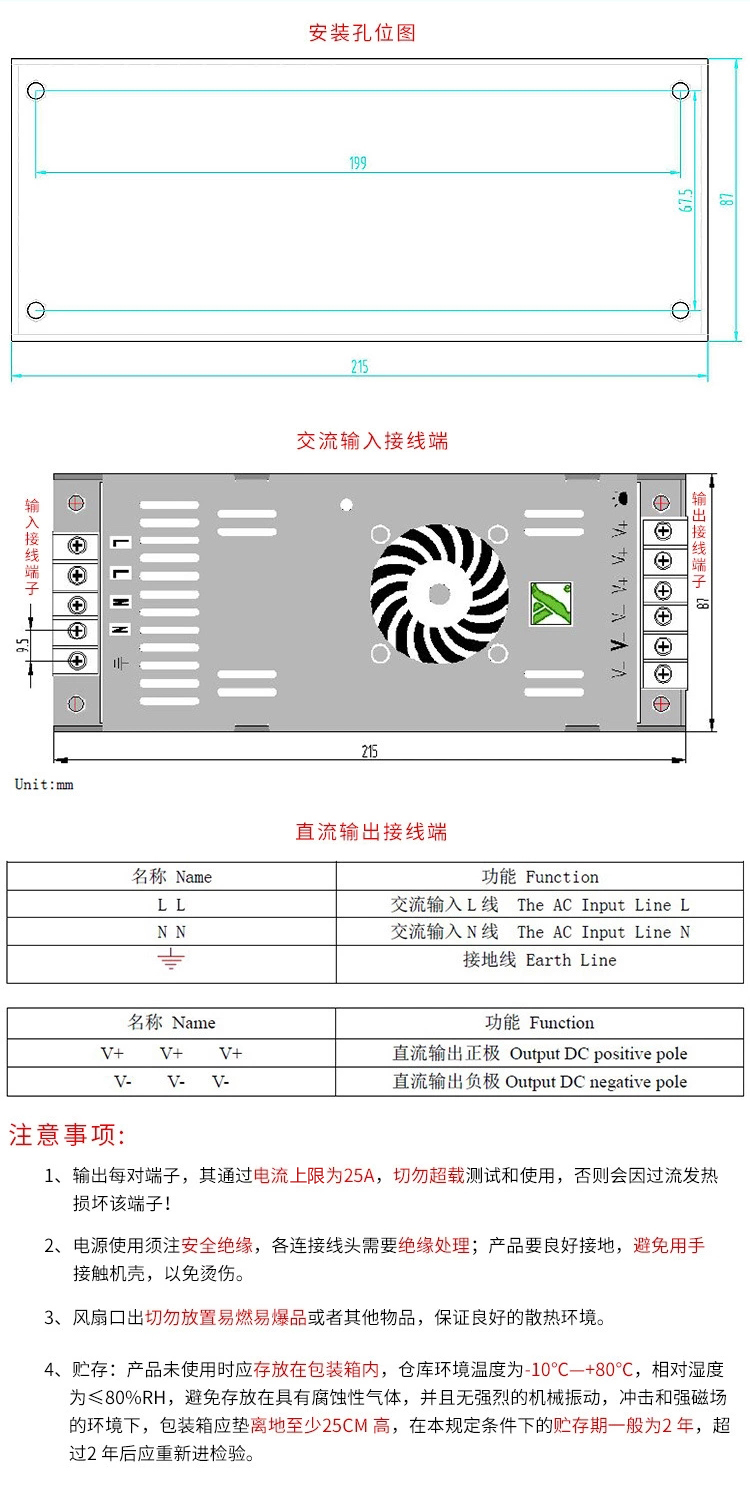 体积小、稳定以及可靠性等特点;电源具有各种完善的保护功能,如输出短路、过温保护。