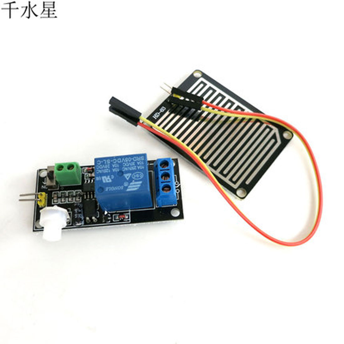 继电器雨滴传感器,带继电器的雨滴或者下雪传感器,本传感器直接可以接3-6V的小电动机或者小水泵。当检测板上的雨滴量达到白色灵敏度调节钮所设定的湿度之后就会使继电器工作,那么你的电机就可以转动或者停止了(电机的动作是转动或者是停止,取决于你选的线路是2和3,还是2和1)接线方式(参考土壤湿度传感器接线链接): (1)用杜邦线链接控制板和检测板; (2)5v电源正负极按标示分别接绿色接线扣上 (3)继电器输出口1,2,3,用来接你的3-5V电机或者灯泡,其中2口为必须选择的一路,1和3任选其一。