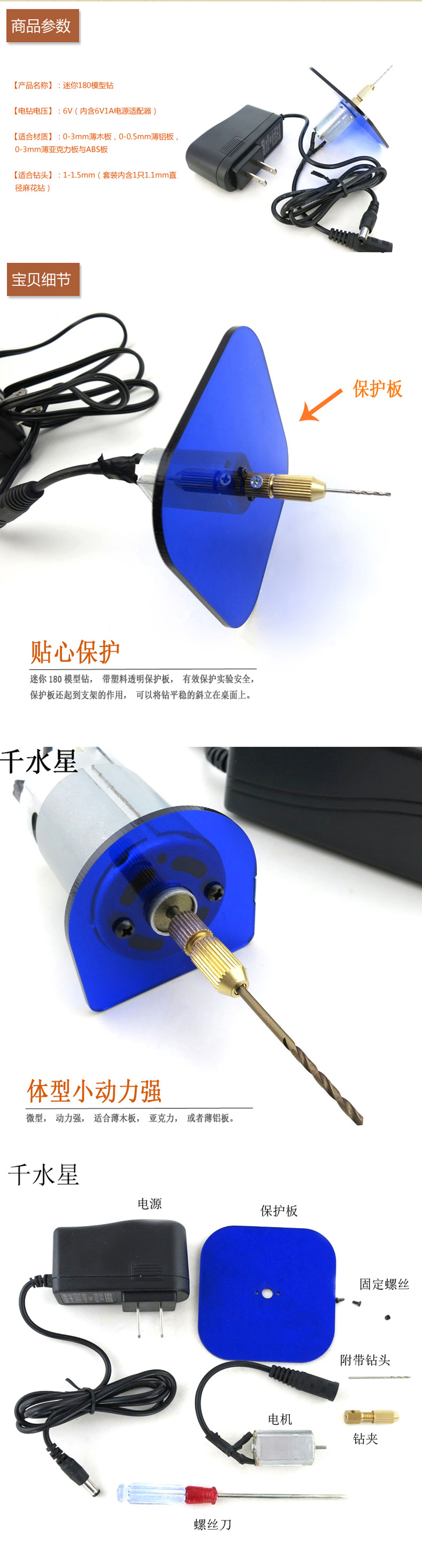 迷你180模型钻,带塑料透明保护板,有效保护实验安全,保护板还起到支架的作用,可以将钻平稳的斜立在桌面上。微型,动力强,适合薄木板,亚克力,或者薄铝板。