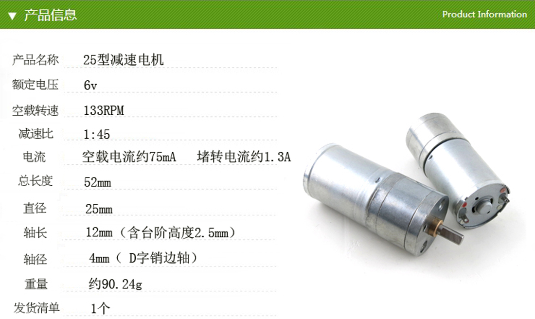 25GB型减速电机,搭配的是370电机,扭力大,性价比高,金属结构,适合制作机器人小车或者其他模型。 【额定电压】:6v 【空载转速】:133RPM 【减速比】:1:45 【空载电流】:约75mA 【堵转电流】:约1.3A 【总长度】:52MM 【直径】:25mm 【轴长】:12mm 【轴径】:4mm( D字销边轴) 【重量】:约90.24g