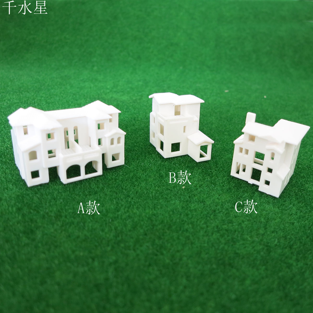 模型别墅,有1:500和1:800两种比例规格。A款是较大的,B款一楼带走廊,C款比较接近方形。 【比例】:1:500和1:800 【材质】:塑料 比例 长*宽*高(mm) 1:800别墅 A款 25*16*16 B款 18.5*14*16 C款 14*13*16 1:500别墅 A款 39.5*26*26 B款 30*23*26 C款 22.5*22*26