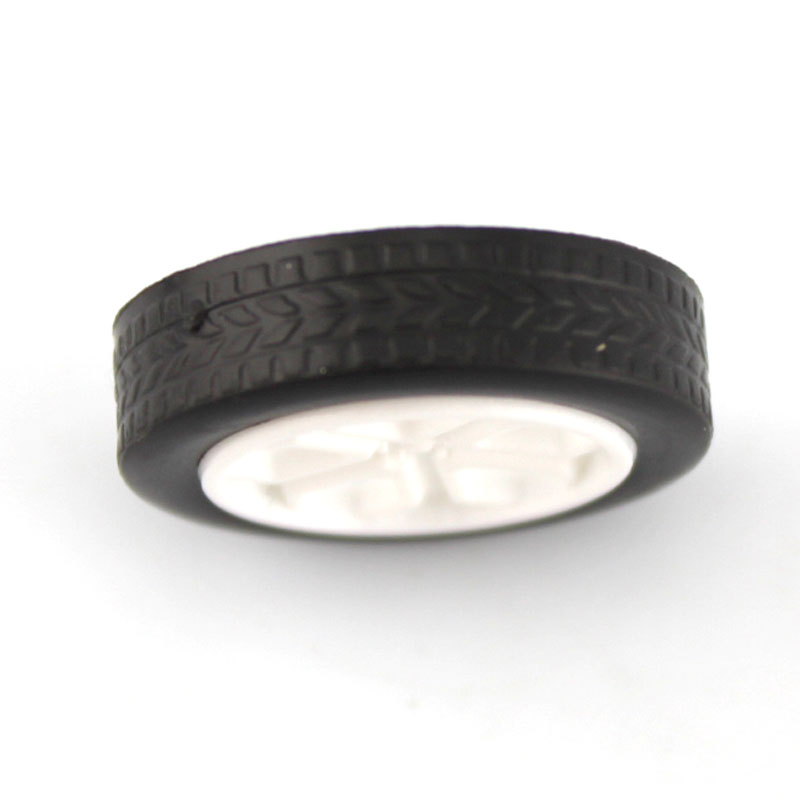 26mm橡胶车轮. 整体外径:26mm 轮毂外径:24mm约 车轮宽度:9mm 中心孔径:1.9mm,紧配2mm车轴 材质:中心是ABS塑料,外皮是橡胶 每只重量:约2.28g