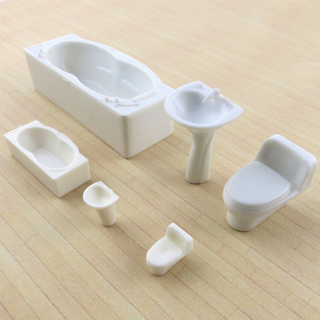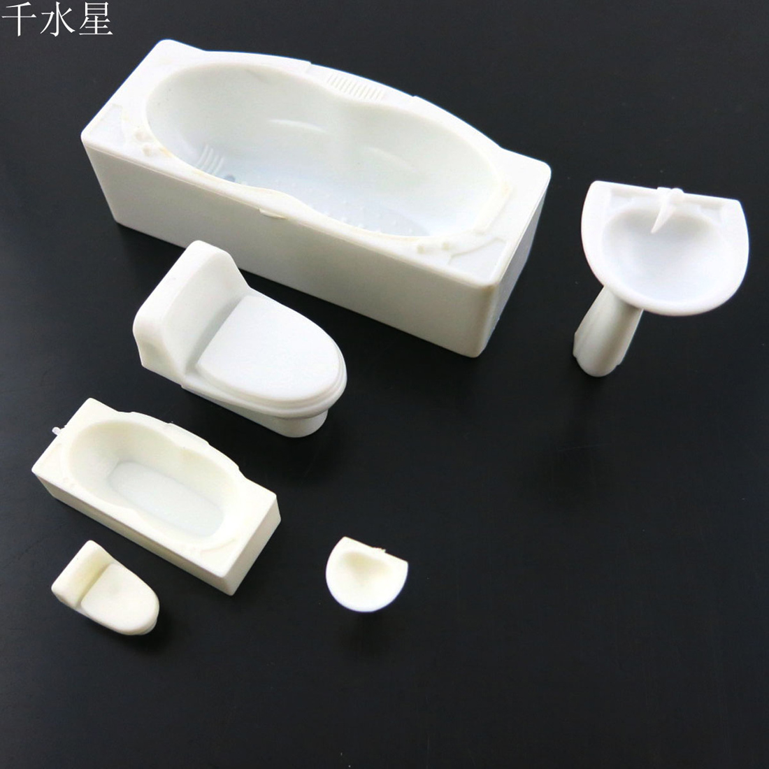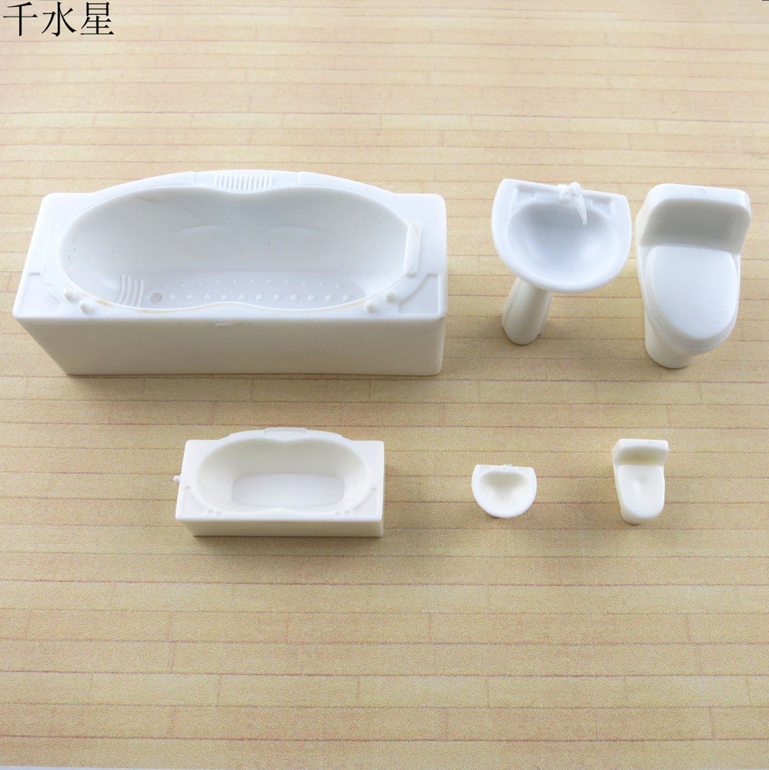 DIY沙盘室内模型卫浴三件套装洁具,洗手盆、浴缸、抽水马桶。 尺寸:(长*宽*高) 1:25套装 【洗手盆】:21.5*19*36mm 【马桶】:28*19*23mm 【浴缸】:70*32*21mm 1:50套装 【洗手盆】:10*9*14mm 【马桶】:13*9*10mm 【浴缸】:32*16*9mm
