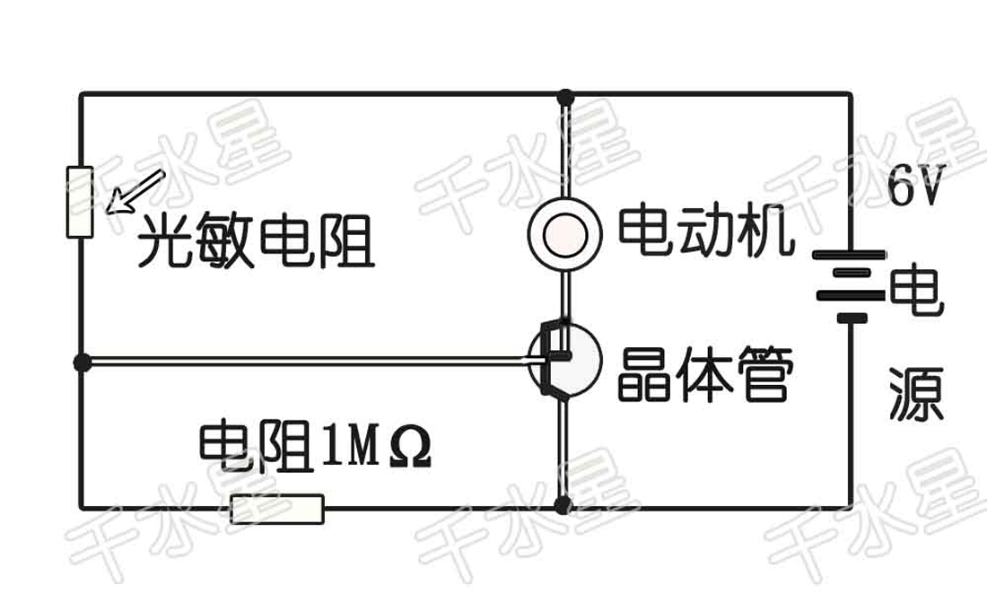 NPN型电路控制开关晶体管(正面朝上,3个脚从左到右,分别为b c e极),可以输出带动6v马达的大电流,适合光控声控马达等等,多次试验,效果很好。DIY光控马达,当光照射到光敏电阻,马达可以转动,光线越强,转速越大。当没有任何光线照射到光敏电阻时,马达停止转动。(晶体管螺丝孔可以用来连接金属片散热) 图和材料参考: