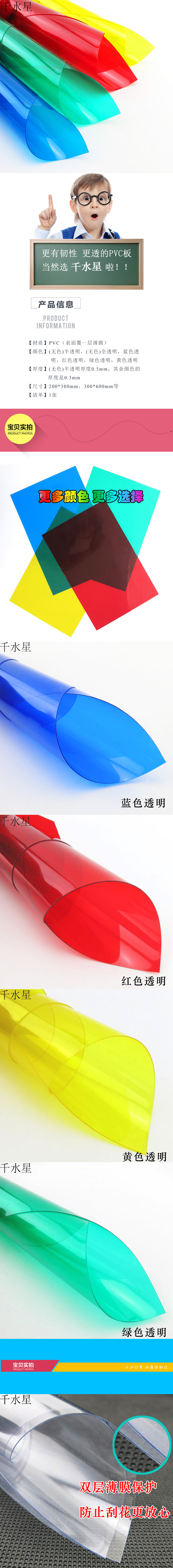 半透明PVC板,半透明,质轻,表面光滑,厚度均匀有韧性。 【材质】PVC(表面覆一层薄膜) 【颜色】(无色)半透明,(无色)全透明,蓝色透明,红色透明,绿色透明,黄色透明 【厚度】(无色)半透明厚度0.5mm,其余颜色的厚度是0.3mm 【尺寸】200*300mm,300*600mm等 【清单】1张。