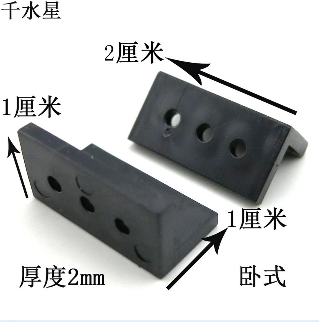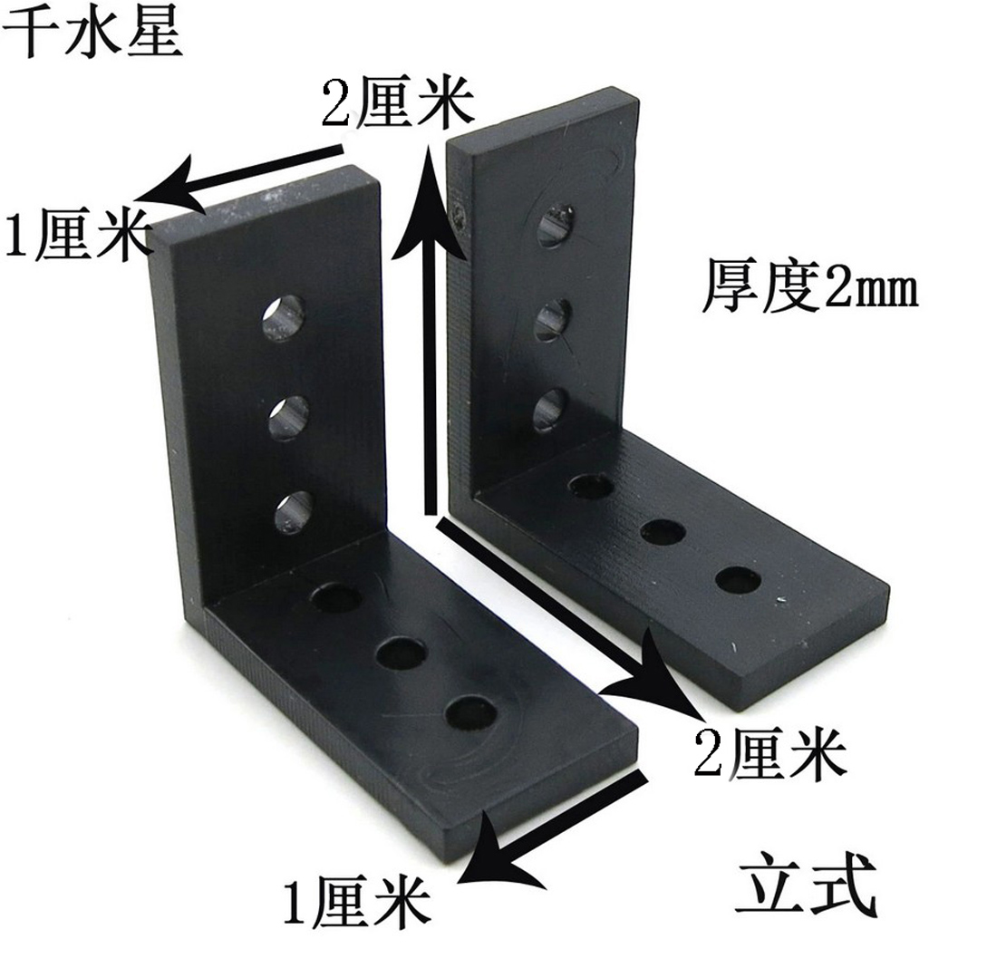 千水星立卧式L型轴架,可以用于固定2张板材成直角形,或者用于模型车轴架。有两种,卧式和立式,一包10个。 卧式尺寸(下图):底边1*2厘米,侧边1*2厘米,壁厚2毫米,孔径2.05毫米,孔距5毫米,一包约8克。