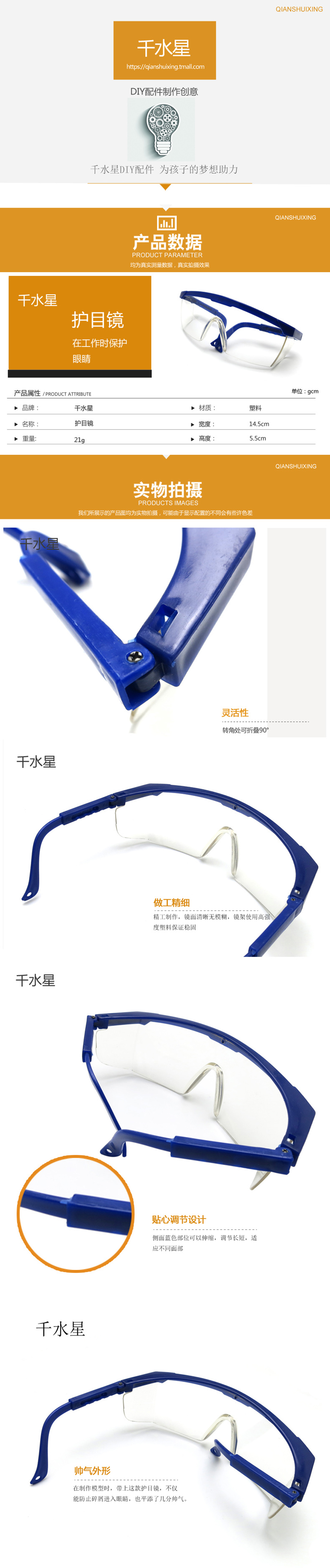 在制作模型的时候,切割和打磨都会产生一定的飞溅小碎屑,一不小心弄到眼睛里,是非常难受的事情,如果能戴上一个保护镜,那就可以在一定程度上减少这种事情的发生。 【宽度】:14.5厘米 【高度】:5.5厘米 【重量】:约21克 【材质】:塑料 【调节】:侧面蓝色部位可以伸缩,调节长短,适应不同面部