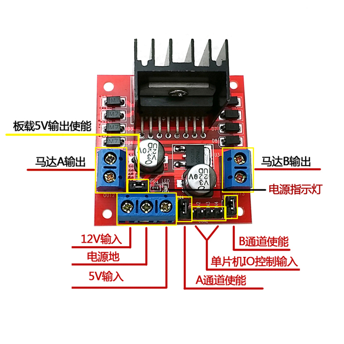 双H桥电机驱动(双路),L298N电机驱动板模块,发热量低,抗干扰能力强,当使用大于12V驱动电压的时候,请使用外置的5V逻辑供电。 (除以下参数不提供技术支持哦)